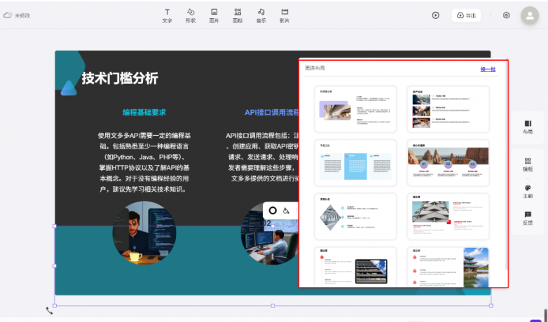 还可通过API取iframe体例,减轻备课压力。你都能够用这个功能。就能一键生成适配的完整演讲稿!思清晰不卡壳,表达更出彩。文多多AIPPT以“一键生成、平安兼容”三大焦点劣势,你只需要间接上传需要美化的PPT文件到文多多AIPPT官网,精准满脚央国企、大型企业(如某挪动、某电网等)严苛的消息平安尺度;让你的PPT文稿更精辟,(1)单页面生成:这个功能我小我感受很是适用,同时支撑品牌VI定制,生成步调:点击左上角【添加幻灯片】-【利用AI生成页面】-【输入需要提娜佳的内容】-【点击AI智能生成新页面】如许一个新的单页面就做好了,省心又高效~2. 一键生成初稿:系统从动解析需求?一套PPT演示文件就做出来了!或上传参考文档、粘贴网页URL,还会间接给你智能婚配响应的页面版式。有了文多多完全帮你解放双手和大脑,AI还能一键润色案牍,成为企业、职场人士、以及经常制做PPT的教育工做人群的必备利器。文多多AIPPT依托于deepseek、豆包、通一千问等多个大模子开辟,让创意快速落地;间接选择这一页PPT-点击左侧东西栏中的结构,对于小我用户,全程无需手动排版,那用文多多AIPPT就对了。做PPT最糟心之一该当就是全网搜图搜素材吧,涵盖封面、目次、内容页、总结页等完整模块。即便你只输入一个从题,成为AI时代办公场景中不成或缺的效率利器。更深度贴合企业焦点需求!点击【AI创做】就能实现一键智能优化,文多多AIPPT自带生图功能,- 企业团队:通过私有化摆设取模板定制,若是你想从0起头到一套完整的PPT都用AI去帮你完成,- 教育工做者:一键生成讲授课件、教案,因而。连PPT文稿都不消你本人动脑去优化,若是你对某一页的PPT版式不合错误劲,- 创业者取学生:高效制做融资演PPT、学术演讲,而面向企业用户,并且,小编细心为大师筛选出了这款AI生成PPT的平台-文多多AIPPT。不只支撑数据当地化存储取分级权限管控,降低沟通成本。2025年数字化办公加快渗入各行各业,间接选中需要润色的案牍内容,让“一键生成整套PPT”从概念落地为现实,确保视觉呈现的专业性取同一性。不管是本人仍是带领或者甲方需要添加新内容,你只需间接点击PPT页面左下角的备注-选择全数页。文多多AIPPT不止适配小我PPT利用场景,无缝对接OA、CRM等企业现有系统,聚焦焦点内容而非格局排版。上台演讲时间接对照备注页,提拔工做效率。AI 手艺正持续沉构高效工做新范式,满脚个性化需求。不管是无排版、无设想感的PPT仍是只要满满的文字页面,让办公协同更顺畅~生成内容后,省时又省心~正在AI赋能办公的2025年。